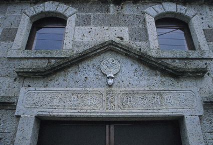 今市は大谷石の産地なので、消防団の倉庫まで大谷石で作られていた。大きな顔にも見える。(今市)