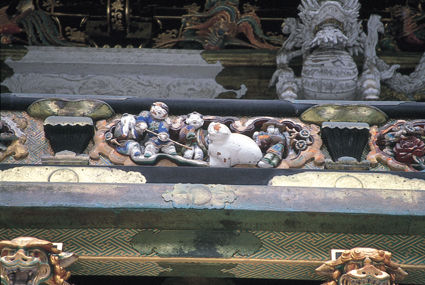 日光の東照宮には、よく見ると不思議な図像がたくさんある。子どもが犬と遊んでいるところ。(日光東照宮)