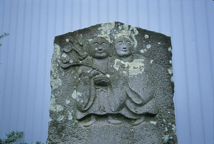 幸手の路上では、ちょっと怪しい彫り物を見つけたんです。二人のお坊さんが夫婦のように寄り添っているんですよ。変でしょ? 道祖神にしては二人の僧侶というのはおかしいですし、なぜこれが彫られたのか、その由来がわからない。