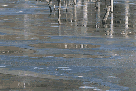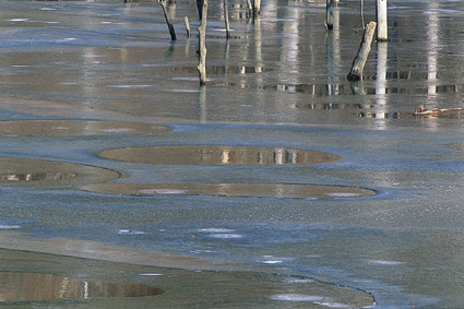 凍結した湖面に降りた霜が徐々に解け始めた。このわずかな時間の間に湖面はさまざまな表情を見せてくれる。湖水から伸びる木立ちをアクセントにしてまだら模様を捉える。
