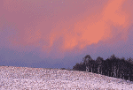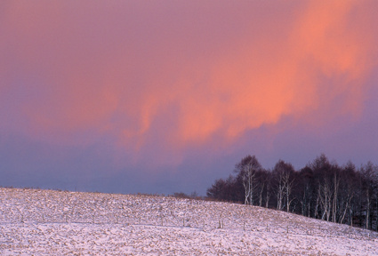丘を通過する雲が朝焼けでサーモンピンクに染まる。その色はさらに地上にも反射し雪面を淡いピンクに色づける。そして雲が通過すれば色の演出は一段落する。