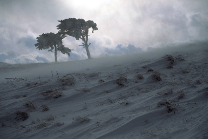 荒れ模様の天候から気まぐれな太陽が顔を覗かせた。逆光で見る雪面は暗い灰色。時折吹き抜ける強風を追うように地吹雪が駆け抜ける。山上の牧草地で出会った厳しい自然美である。