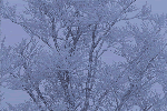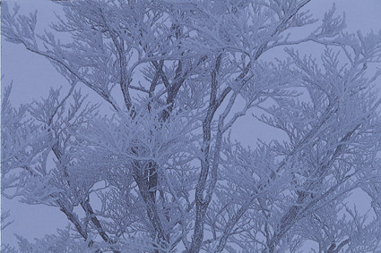 樹氷する木立ちをアップで捉える。枝の配列や隙間のバランスに注意しながら画面全体を整えていく。左右上下と微調整するフレーミングはいくら寒くてもおろそかにできない詰めの作業である。