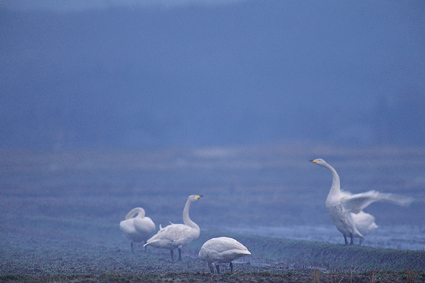 田んぼに降り立った白鳥が餌をついばみながら長旅の疲れを癒している。それぞれの仕草や動作を観察して、周辺との組合せから構図を決定することが自然な雰囲気を捉えるコツである。