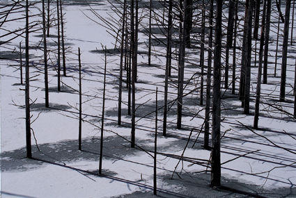 木立ちと交錯するのはそれらの影である。幹の根元には丸い雪解け模様がある。直線や円形といった素材のパターンを生かして構図を描いた。