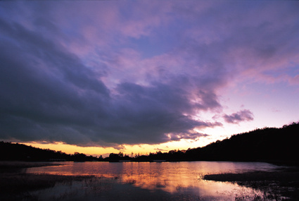 静まり返った池を覆うように現れた鉛色の雲。バックには美しい夕焼け空が広がっている。動きのある雲と湖面への夕焼けの映り込み。さらに周囲の山陰など、すべてを注意深く配列しないと風景としての一体感が失われてしまう。