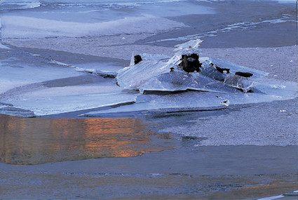 氷点下15度を下回る厳しい冷え込みに川が凍った。日の出を前にして流れが氷を砕いていく。ひび割れ、溢れ出る水面に朝焼けが映った。