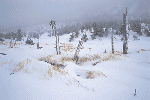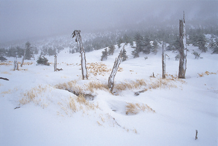 降雪で霞む遠景に荒涼とした雪の原野が広がる。そして数本の枯れ木立ちが殺伐とした光景を印象づける。ややアンダー気味に露出設定することで出会いの印象を表現した。