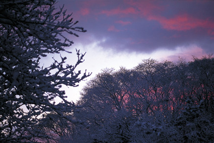 冬枯れの林と朝焼け。空模様だけで季節を表現するには限界がある。そのため地上の景色を生かすことが大切で相乗効果が期待できる。