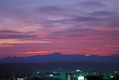 もっとも、頭を右に振りますと、富士山を望むことができます。夏の夜、懐中電灯をつけて登る、登山者のあかりが中腹から頂にかけて線を描いたように浮かびあがる時があります。そんな日はなぜかワクワクした気分になります。