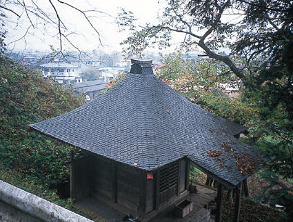 登米はスレートの産地でもある。このお寺は屋根にスレートを用いていて、雨を受けるとシットリとした趣が出る。(登米)