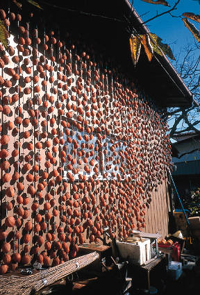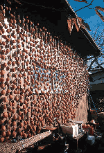 蔦がからまる、ならぬ干柿が連なる家。おいしそうな家である。(金成)