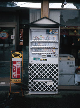 登米で見つけた自販機。何も自販機に屋根やナマコ壁をつけなくてもよさそうなものだが。(登米)