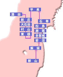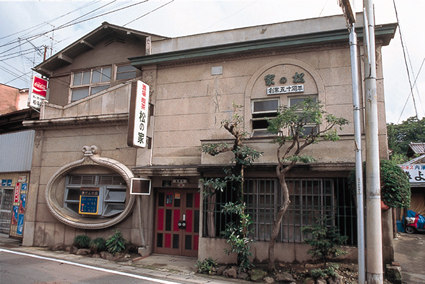 大きな巾着袋の飾りがあるお店。大金を持ったお客さんに来てほしいのか、それだけ大きな巾着袋を持つほど儲けたいのか。温泉らしい風情のお店だ。(飯坂温泉)