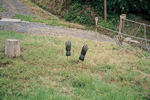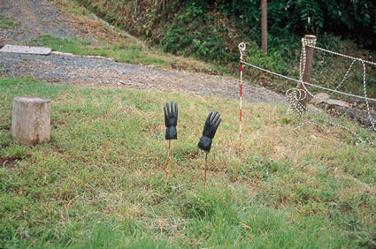 古代遺跡を掘ったときに使った手袋を、棒の先にさして並べて干してある。地面からニュッと古代人の手が伸びてきているようにも見える。(多賀城址) |