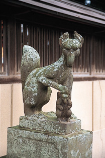 いたずらした子狐を叱っている親狐。でも、親狐の方が悪さをしそうな顔をしている。(岩沼) |
