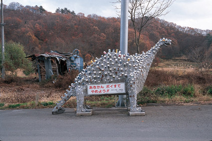 左官職人の伝統が脈々とある土地柄のせいか? 空き缶のポイ捨て禁止を呼びかけるために、空き缶で恐竜を作ってしまった。(大石田) |