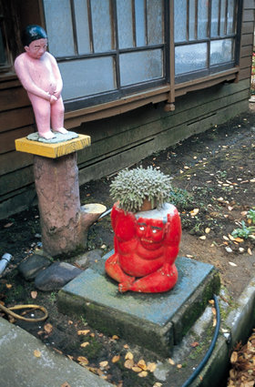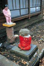 大石田にいた左官職人佐藤金太郎さんは、異様なコンクリート彫刻を作る人だった。これは小便小僧が邪鬼におしっこをひっかけている国籍不明の作品。(大石田) |