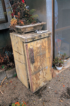 擬木の冷蔵庫。冷蔵庫をコンクリートで固めて木目の模様をほどこし、木に見せかけている。なにも冷蔵庫を擬木にしなくてもいいのでは、と思うのだが…。(大石田) |