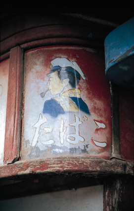 たばこ屋のショーケースにあったガラス絵。マドロスがパイプを加えている絵なのだが、そのマドロスが、どう見ても少年に見える。少年はパイプを吸ってはいけないはずなのだが…。(郡山)