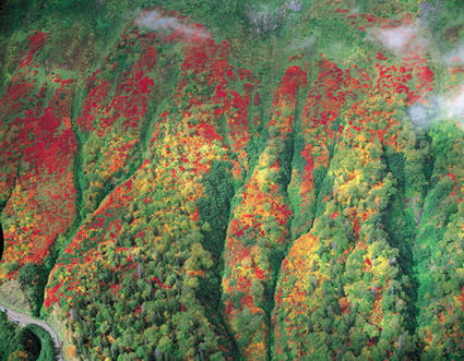 一番早く秋の知らせを受け取る地、北海道大雪山系は初冠雪とともに紅葉の競演がはじまる。他の地域では見ることのできない鮮やかさだ。