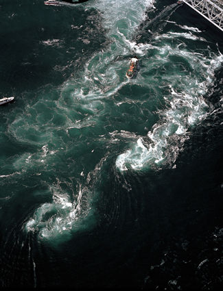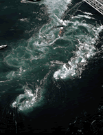鳴門の渦潮は、春と秋の大潮の時期に日本の最高潮流の10ノットに達し、渦の直径は30mにもなる。観潮船も舷を傾けることが多々ある。