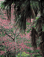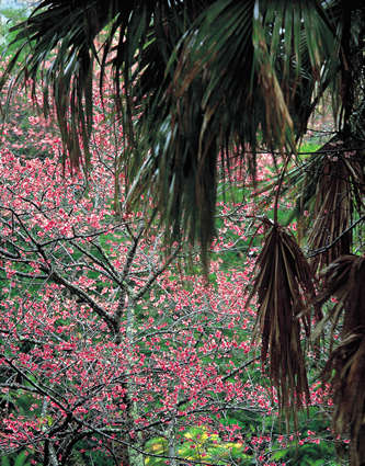 | 沖縄の桜は紅い色をしているヒカンサクラ。南国らしさを出すために、クバの葉を手前にシルエットにして入れた。雨の日に撮影。 ■カメラ:リンホフマスターテヒニカ4×5 レンズ:400mm 絞り:f22 シャッタースピード:2秒 フィルム:RDPU 撮影地:沖縄県名護城のヒカンザクラ |
