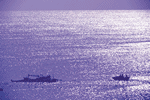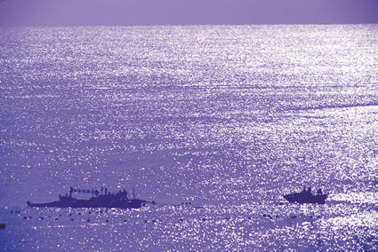 対馬海峡の澄んだ空気をフィルムに定着させるために、海面いっぱいの光を取り込んだ。定置網を仕掛ける人のシルエットの形に気配りした。