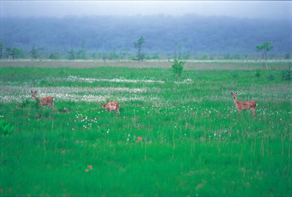 早朝、湿原に鹿を発見した。かれらが、こちらの望む姿になるまで、待った。朝の、すがすがしい空気が写りこむよう、ややオーバー目の露出を選んだ。