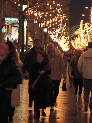 シャンゼリゼ通りを行く人々。高感度フィルムでイルミネーションの明かりを頼りに撮った。