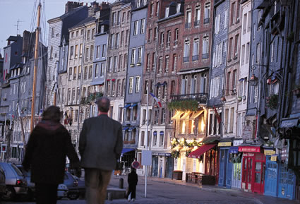 パリから300キロほど離れたオンフルールという海岸街。400〜500年前の古い街並みで、建物ごとに表面の素材が違っているのは、建築された時代が異なるため。また、同じ建物でも階が変わると素材が違っているものもある。画家にも人気が高い街。一軒だけライトがついているのが面白い。