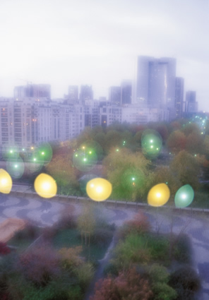 パリの公園。ソフトフォーカスレンズで公園を照らすライトを写し込んだ。