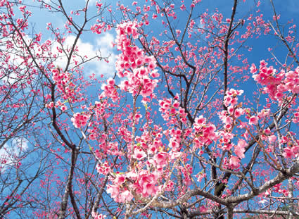 沖縄の桜は少しピンク色が濃いヒカンサクラ。初夏のような青空をバックにレフ板をきかせて、下から上を向いて構図を決めた。ワイドレンズを使ってにぎやかな感じを狙った。