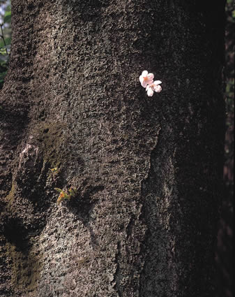 太く黒い幹の真ん中から咲いた一輪。まわりのにぎやかさをカットして、ひっそりとした雰囲気を狙った。