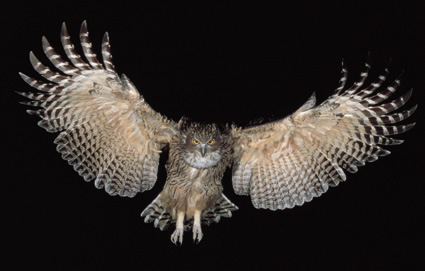 シマフクロウ ■カメラ:キヤノンT90 レンズ:FD28-85mmF4 絞り:f11 シャッタースピード:1/60秒 フィルム:フジクロームRDP ストロボ使用 撮影地:北海道