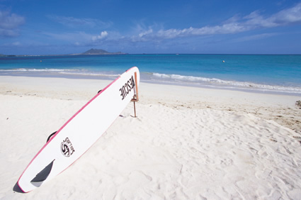 サーフボードが1個、白い砂浜にデザインされたように置いてありました。これはハワイオアフ島の裏側の海岸です。気に入っているスナップの1枚です。