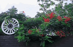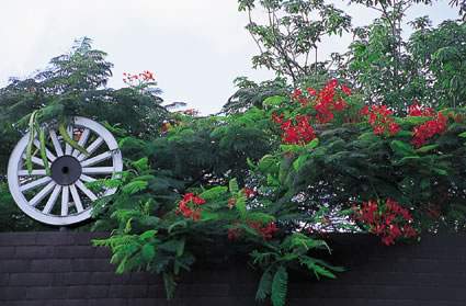 高い堀の上にハイビスカスの花と車輪が飾ってあって、ちょっと面白い光景です。この写真では広いイメージがでていませんが、これはレンズでここだけ切り取ったためです。グリーンと赤と白のコントラストです。