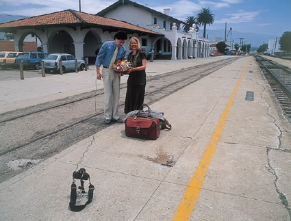 アメリカの田舎の駅で、新婚さんでしょうか。駅舎をバックに長いリモコンをつけて2人で記念写真を撮っているところです。持ってるものがいい。果物やお菓子がいっぱいのカゴと、いっぱいの笑顔を見て、「お幸せにね。」と一枚撮らせていただきました。