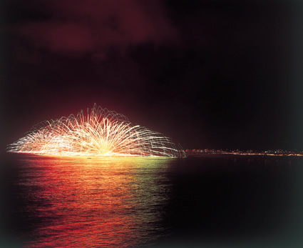31歳の時のこと、先生のもとに某新聞社から、大阪の天神祭りを取材する話が舞い込みました。三日に渡って祭りの行事を撮影する仕事です。その仕事中に先生は、特等席から見上げた花火に深い感銘を受けます。「それまで、私にとって花火といえば、人混みの中で遠くから眺めるものでした。ところが、その時に見た花火は頭の真上で開いたのです。その大きさと音に圧倒されました。そして何よりも、報道の現場で、すさんでしまった私の気持ちを、その時の花火が癒してくれたのです」。