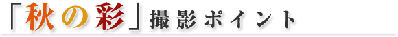 | このページはお客様からの「撮影ポイントを教えてもらいたい」という声に応えて企画しているページです。掲載されている撮影ポイント及び写真は、「第10回全国秋の彩フォトコンテスト」に入賞された方々のご協力をいただきました。撮影者の方々からの撮影アドバイスも掲載していますので、参考にしてください。 |
