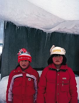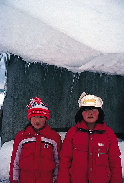 (上)【赤と白】真っ白な雪の中、赤いアノラックで赤いほっぺの子供たちが印象的だったので、シンプルに撮ってみた。