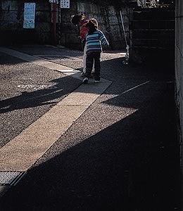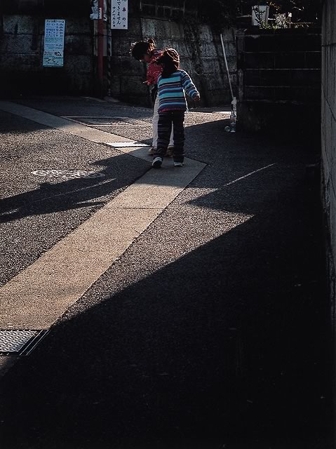 塀の影が面白いと思ってカメラを構えていたら子供が入ってきた。いいスナップの基本は子供を追いかけ回すことではなく、情景を撮ろうと思っているときに偶然に人間が画面に入ってくるときに生まれる。 |
