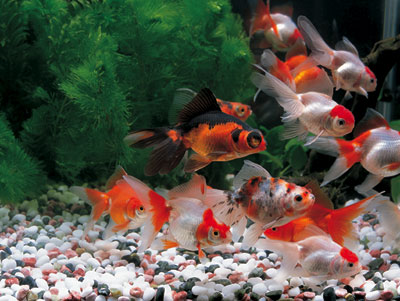 上からのライティングで、カメラが水槽のガラスに写り込まないように黒い布で覆います。露出決定はインスタント・フィルムでチェックします。