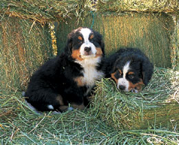 【バーニーズ・マウンテン・ドッグ(原産国:スイス)】撮影のために乳牛用の飼料の干し草を乗用車で運んだり、気温が高く、陽のあたる場所を嫌がったりと、なかなか苦労した撮影でした。