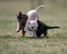【チワワ(原産国:メキシコ)とミニチュア・ダックスフンド(原産国:ドイツ)】イタズラ盛りの2〜3ヶ月の子犬達は、小枝はもちろん、何でもオモチャにして遊びます。