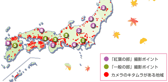 このページはお客様からの「撮影ポイントを教えてもらいたい」という声に応えて企画しているページです。掲載されている撮影ポイント及び写真は、「第11回全国秋の彩フォトコンテスト」に入賞された方々のご協力をいただきました。撮影者の方々からの撮影アドバイスも掲載していますので、参考にしてください。 地図上の番号をクリックすると詳細が確認できます。 説明の番号は (1)撮影者 (2)撮影場所 (3)撮影チャンスと時期 (4)撮影アドバイス (5)交通手段