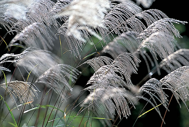 【ススキの輝き】ススキの穂が逆光に輝いて美しい。背景は暗い谷間を選んで、この黒のなかに白い穂の姿を浮かべて際立たせている。望遠を使って、穂の重なりを強調。