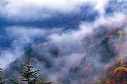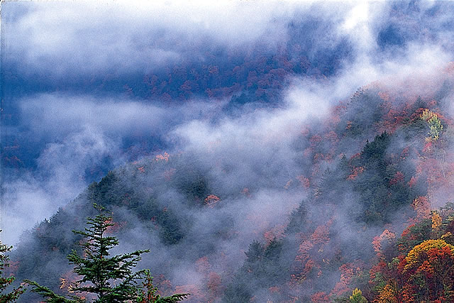 【山霧覆う】山の霧が山腹に漂って、幽玄な雰囲気を醸しだしている。望遠ズームを生かし、前景の木立とのバランスを計算しながら撮影した。