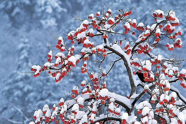 【雪化粧】日本人が干し柿をあまり食べなくなって、こんな風景が日本の山村のあちこちで見受けられるようになった。いわば、日本の新しい初冬の風景。