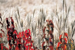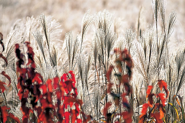 【草紅葉】ススキの穂に灌木、そして草むらの秋の色合い。逆光ライティングでそれぞれの輝きを抽出したもの。